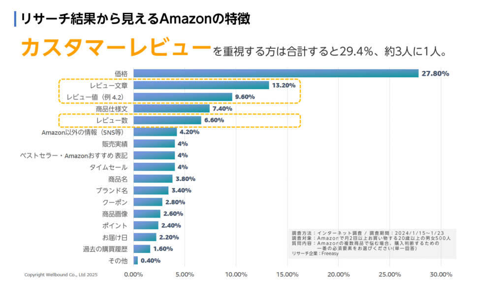 実際の調査結果によると、Amazonで商品を選ぶ際に「レビューを最も重視する」と回答した購入者は24.1%にも上ります。これは商品名や配送日、Amazonおすすめ表示よりも高い数値であり、レビュー対策の重要性を物語っています。